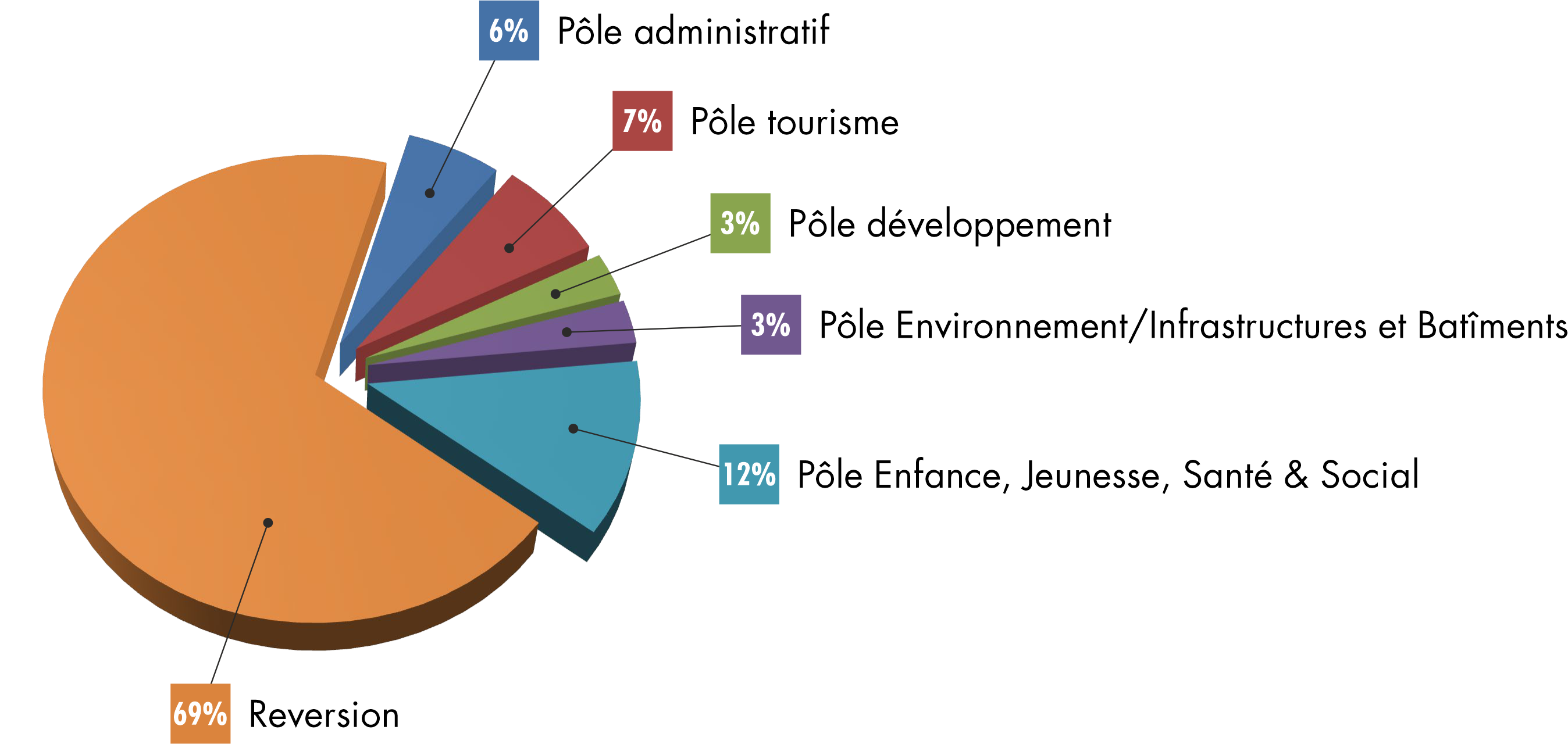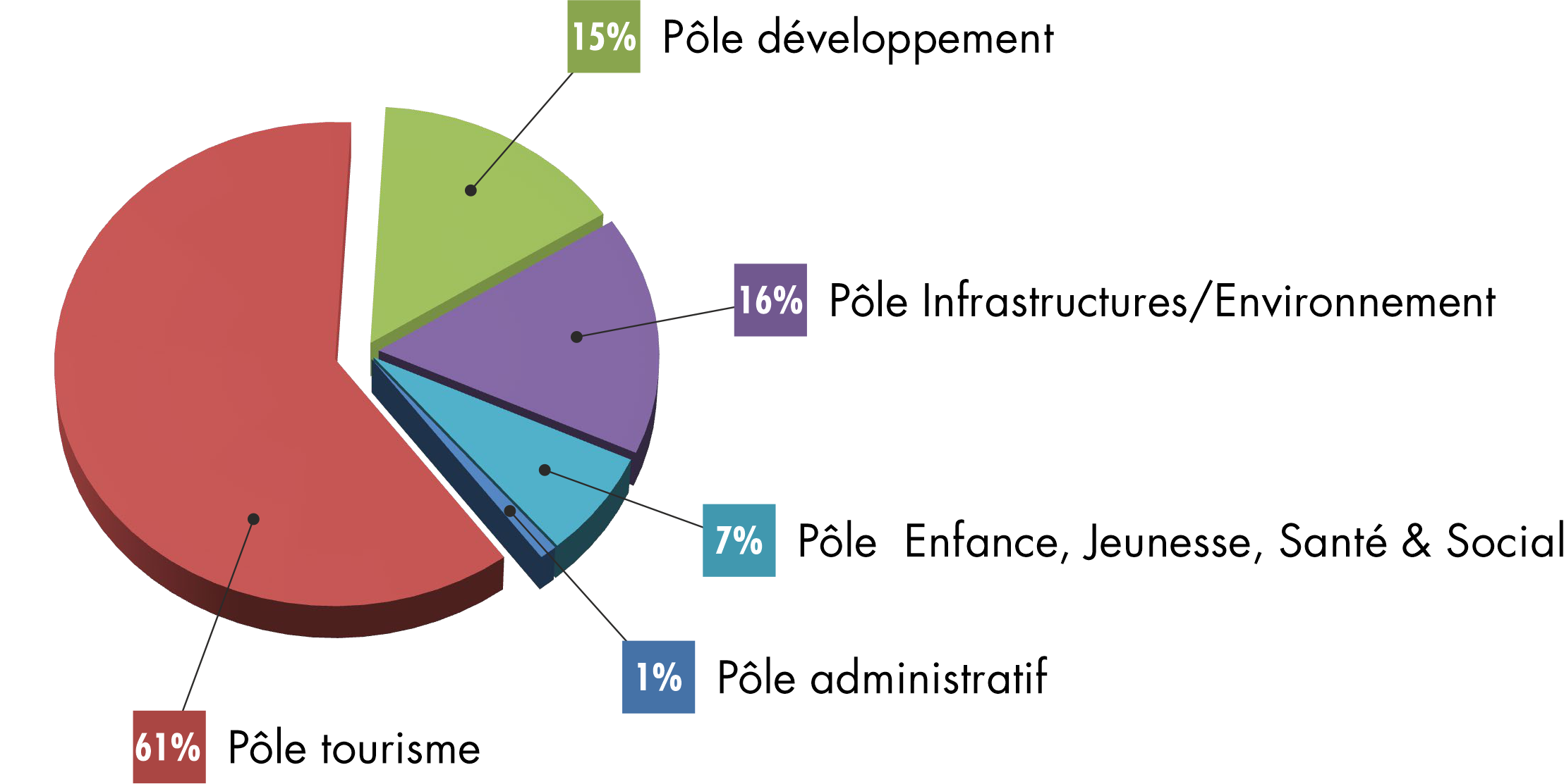 Le service infrastructure environnement, comprenant notamment la gestion des déchets , consomme 25% du budget, le tourisme 15% et le service administratif moins de 10%.