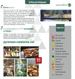 Pour pratiquer le VTT en Pyrénées Catalanes, nous ne saurions trop vous conseiller de profiter des senteurs du printemps ou de l'arrière-saison. Vous ne le regretterez pas… Les chaleurs estivales nécessitent de porter une attention particulière au ravitaillement en eau. Si vous êtes néophyte, nous vous conseillons de suivre attentivement les descriptifs de chaque itinéraire, le balisage et la signalétique de terrain (voir explications ci-dessous). Malgré un contrôle régulier, l'aspect d'un tracé peut changer, la nature n'étant pas figée. Il en est de même pour les kilomètres indiqués, d'un compteur à un autre, les distances peuvent varier légèrement.